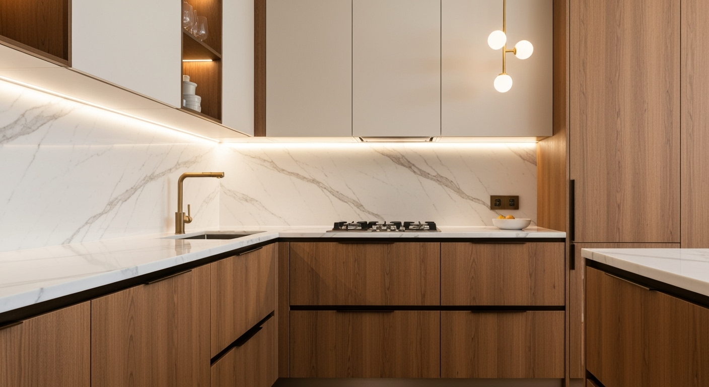 Italian hardware, soft-close mechanisms, handleless designs, moisture-resistant substrates, and on-site installation teams.